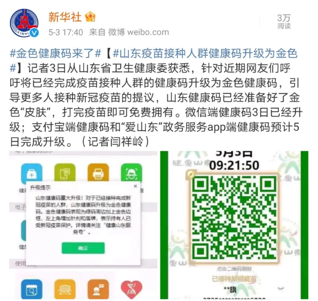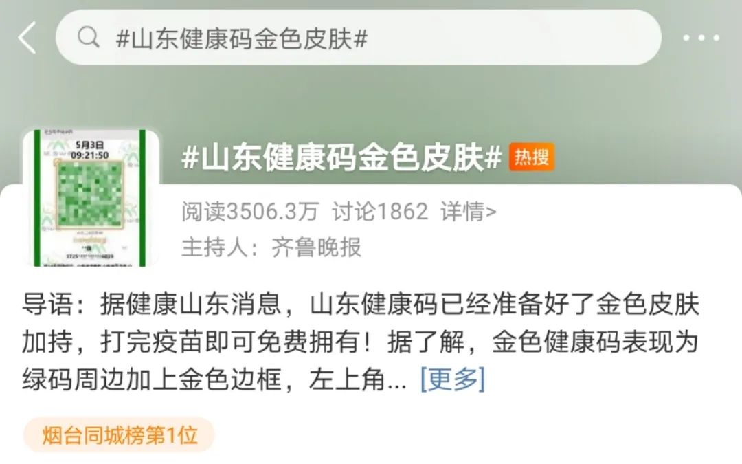 據(jù)健康山東消息,山東健康碼已經(jīng)準備好了金色皮膚加持,打完疫苗即可免費擁有!據(jù)了解,金色健康碼表現(xiàn)為綠碼周邊加上金色邊框,左上角增加針劑和盾牌,表示持有人已受新冠疫苗保護。