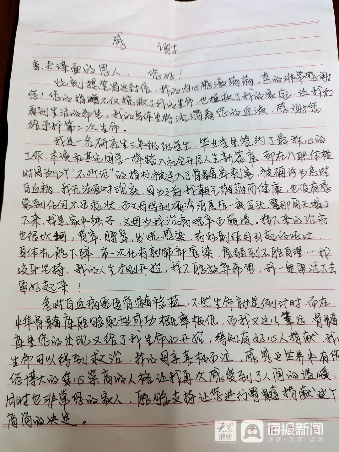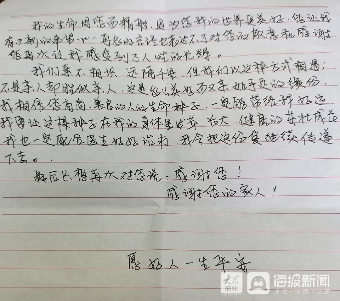 在醫(yī)院的王潤川收到了一封手寫的感謝信,這封信出自研究生小伙之手,雖然雙方都不知道彼此的身份,但這次捐助,卻將兩個家庭聯(lián)系在了一起。