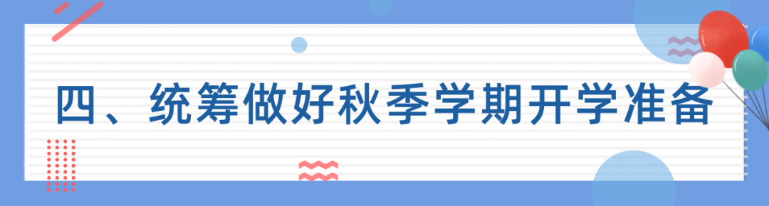 各級教育行政部門和學(xué)校要做好假期校舍管理,落實值班制度,完善防汛及應(yīng)對極端天氣舉措。要利用假期做好校舍安全檢修、改造加固等工作,精心做好開學(xué)前各項準(zhǔn)備工作,確保新學(xué)期教育教學(xué)正常順利開展。要切實按照疫情常態(tài)化防控工作要求,密切關(guān)注疫情防控形勢,切實指導(dǎo)學(xué)生、家長、教職員工合理安排假期出行及開學(xué)前準(zhǔn)備工作。