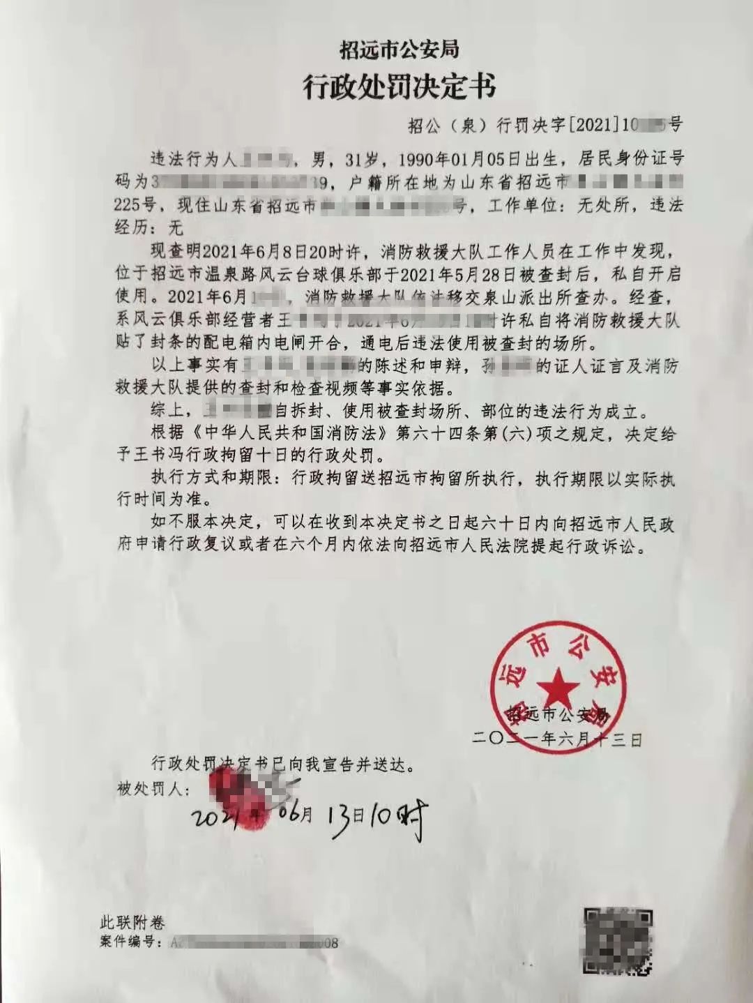 6月13日,招遠市風(fēng)云臺球俱樂部經(jīng)營者王某某因擅自使用被查封場所,被招遠市消防救援大隊送至派出所處以行政拘留十日的行政處罰。