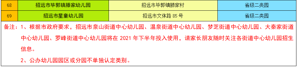 您好!“幼有所育、幼有優(yōu)育”,讓每個(gè)孩子都能享有公平而有質(zhì)量的學(xué)前教育,需要全社會(huì)的共同努力。近年來,招遠(yuǎn)市委、市政府高度重視學(xué)前教育,不斷加大學(xué)前教育財(cái)政投入,想方設(shè)法擴(kuò)增優(yōu)質(zhì)普惠學(xué)前教育資源,快速推進(jìn)五所街道公辦中心園建設(shè),認(rèn)定了一批普惠性民辦幼兒園,大大滿足區(qū)域幼兒入園需求。一年一度的幼兒園招生工作已經(jīng)開始,為孩子創(chuàng)造一個(gè)安全的教育環(huán)境是我們共同的心愿和責(zé)任,希望各位家長從孩子身心健康和生命安全出發(fā),理智選擇。為了讓孩子在安全、快樂的環(huán)境中健康成長,招遠(yuǎn)市教育和體育局提醒家長朋友在為孩子選擇幼兒園時(shí)注意以下事項(xiàng):一、明確招生方式和招生原則。幼兒園招生堅(jiān)持就近就便、免試入園的原則,各類幼兒園實(shí)行學(xué)年初(秋季)一次性招生,具體招生時(shí)間由各幼兒園自行確定。一般每年1-4月份幼兒園發(fā)布招生簡章,8月下旬前完成招生工作,幼兒園平時(shí)如有空余學(xué)位,可隨時(shí)補(bǔ)招。二、認(rèn)真了解幼兒園辦園資質(zhì)。為給孩子選擇一所能讓“孩子安心、家長放心”的幼兒園,家長朋友在為孩子選擇幼兒園時(shí),一定要仔細(xì)了解幼兒園辦園資質(zhì),查看幼兒園有關(guān)證件是否齊全。目前,我市共有證照齊全且年檢合格的合法幼兒園69處(名單附后)。望家長朋友們不要被非法幼兒園誤導(dǎo),非法園普遍存在無辦園許可證、管理不規(guī)范、疫情防控措施不到位、無食品經(jīng)營許可證、缺乏市場監(jiān)管部門對(duì)食品安全監(jiān)管、安保及園舍安全不達(dá)標(biāo)等問題,孩子們飲食安全和人身安全無法保證,存在諸多危及幼兒安全的隱患,同時(shí)非法園還存在退費(fèi)難、出現(xiàn)糾紛維權(quán)難等突出問題。希望各位家長從孩子的安全、身心健康和快樂成長著想,一定要選擇有辦園許可證且經(jīng)過有關(guān)部門核驗(yàn)合格的合法幼兒園。 三、做到統(tǒng)籌兼顧,理性擇園。保教質(zhì)量和管理水平是保證孩子健康成長的根本。在為孩子選擇幼兒園時(shí),家長一定要親自到幼兒園現(xiàn)場查看辦園許可證、食品經(jīng)營許可證等證件,了解幼兒園的辦園條件和保教質(zhì)量,確保孩子吃的好、玩的好、學(xué)的好,能夠安全健康快樂地成長。親愛的家長朋友,幼兒身心健康、快樂成長是你我共同的心愿,也是教育人持之以恒的奮斗目標(biāo)。時(shí)光不語,靜待花開。讓我們攜手并肩、同心協(xié)力,為規(guī)范我市幼兒園發(fā)展,營造幼兒健康成長的良好環(huán)境努力前行!幼兒園違規(guī)招生舉報(bào)電話:8255511 (證照齊全且經(jīng)過開園核驗(yàn)合格的)點(diǎn)擊圖片↓可查看大圖
