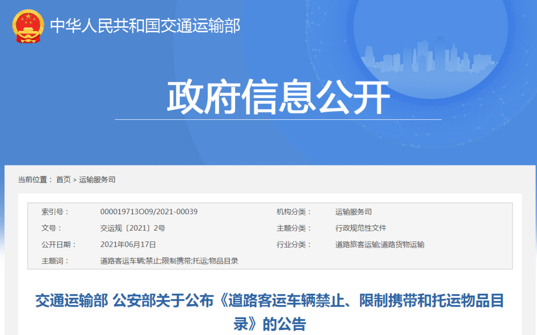 近日,交通運(yùn)輸部、公安部聯(lián)合印發(fā)《道路客運(yùn)車輛禁止、限制攜帶和托運(yùn)物品目錄》(簡稱《目錄》),以保障旅客人身財(cái)產(chǎn)安全和道路旅客運(yùn)輸安全。《目錄》自2021年6月20日起施行。