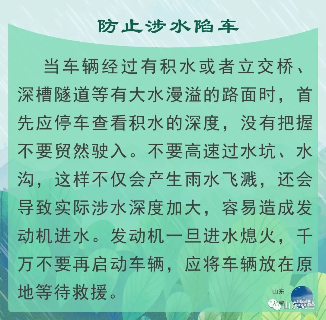 遇到積水路面要仔細觀察水深,可參照前車通過情況來判斷,若前車通過,就安全(當然如果前車是大型車、底盤高的越野、SUV等,當參照物就不合適了),如果水深就繞路。通過時速度要慢,以免激起水花進入發(fā)動機。