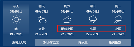 3日白天,晴轉多云;東南風短時東北風3-4級;最低氣溫19℃。最高氣溫26℃。