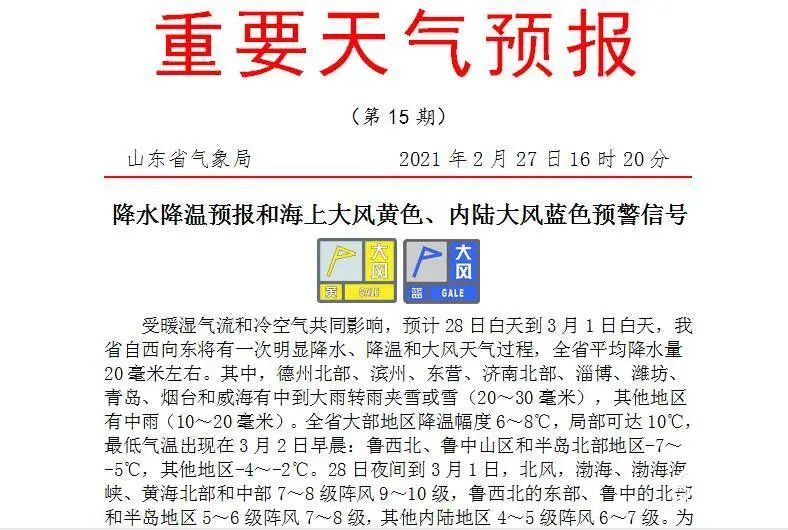 山東省氣象臺于2021年2月28日06時00分繼續(xù)發(fā)布內(nèi)陸大風(fēng)藍色預(yù)警信號↓↓今天夜間到明天,受冷空氣影響,我省將出現(xiàn)大風(fēng)降溫天氣。北風(fēng),魯西北的東部、魯中的北部和半島地區(qū)5~6級陣風(fēng)7~8級,其他地