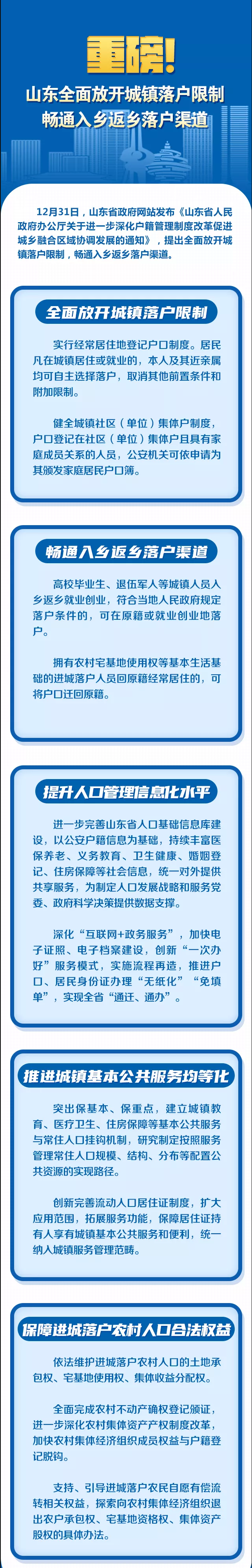 全宇宙只有不到1%的人點(diǎn)擊上方進(jìn)入招遠(yuǎn)信息港你真是個(gè)特別的人12月31日,山東省政府網(wǎng)站發(fā)布《山東省人民政府辦公廳關(guān)于進(jìn)一步深化戶籍管理制度改革促進(jìn)城鄉(xiāng)融合區(qū)域協(xié)調(diào)發(fā)展的通知》,提出全面放開(kāi)城鎮(zhèn)落戶限