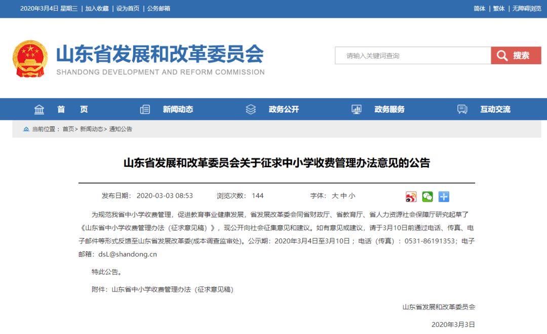 全宇宙只有不到1%的人點(diǎn)擊上方進(jìn)入招遠(yuǎn)信息港你真是個(gè)特別的人3月3日,山東省發(fā)展和改革委員會(huì)官網(wǎng)發(fā)布《關(guān)于征求中小學(xué)收費(fèi)管理辦法意見的公告》圖源:山東省發(fā)展和改革委員會(huì)官網(wǎng)為規(guī)范中小學(xué)收費(fèi)管理,促進(jìn)教